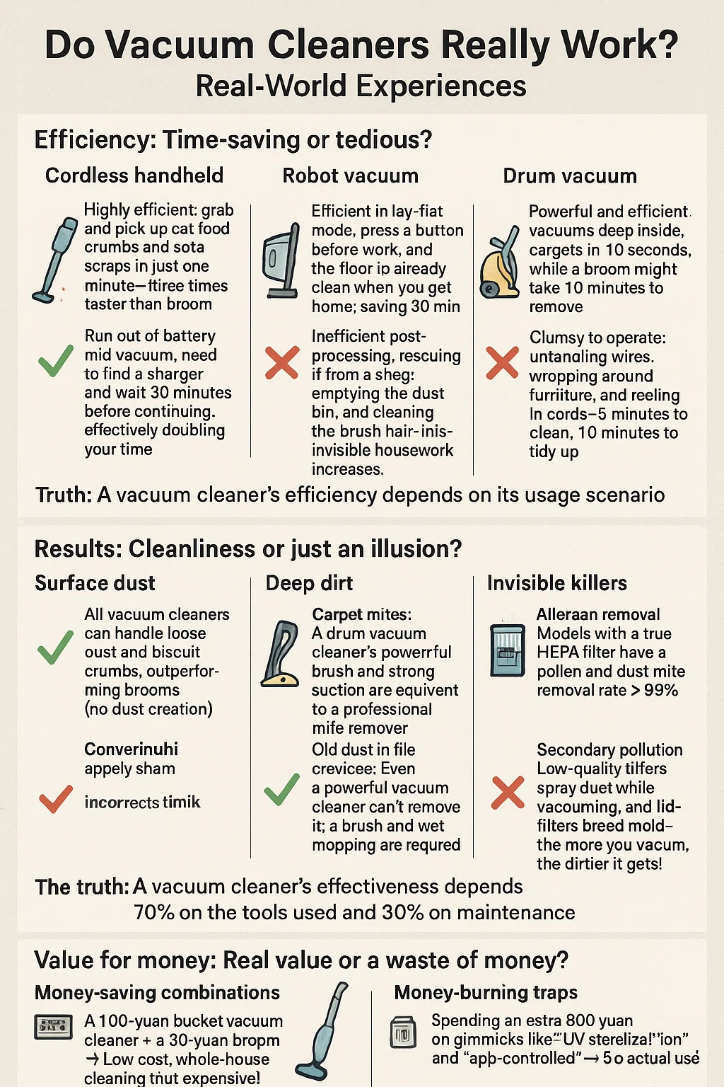Trumvakuum: Kraftfull och effektiv: Vakuum djupt inuti mattor på 10 sekunder, medan en kvast kan ta 10 minuter att ta bort. Klumpig att använda: otanglande ledningar, lindar runt möbler och rullar i sladdar - 5 minuter för att rengöra, 10 minuter för att städa upp. Sanningen: En dammsugares effektivitet beror på dess användningsscenario.