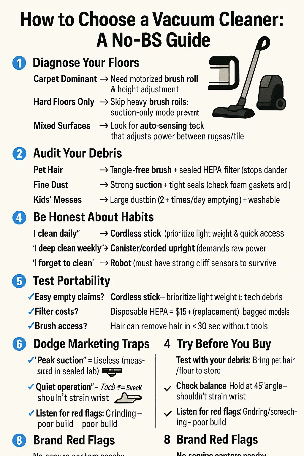 Endast hårda golv → hoppa över tunga borstrullar; Sug-endast läge förhindrar repor.