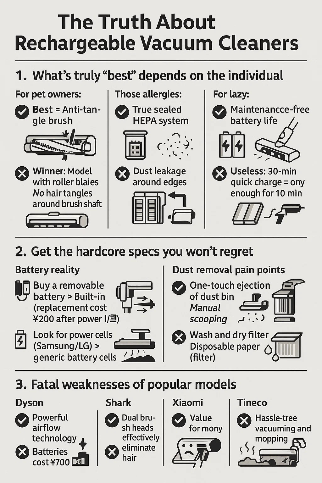 För husdjursägare: "Best" = Anti-Tangle Brush Inga hår trasslar runt borstaxeln. Vinnare: Modell med rullblad (suger och skär samtidigt och eliminerar demontering). Gimmick: 200Aw Sug Power, men rullborsten kräver en halvtimme manuellt hårborttagning.